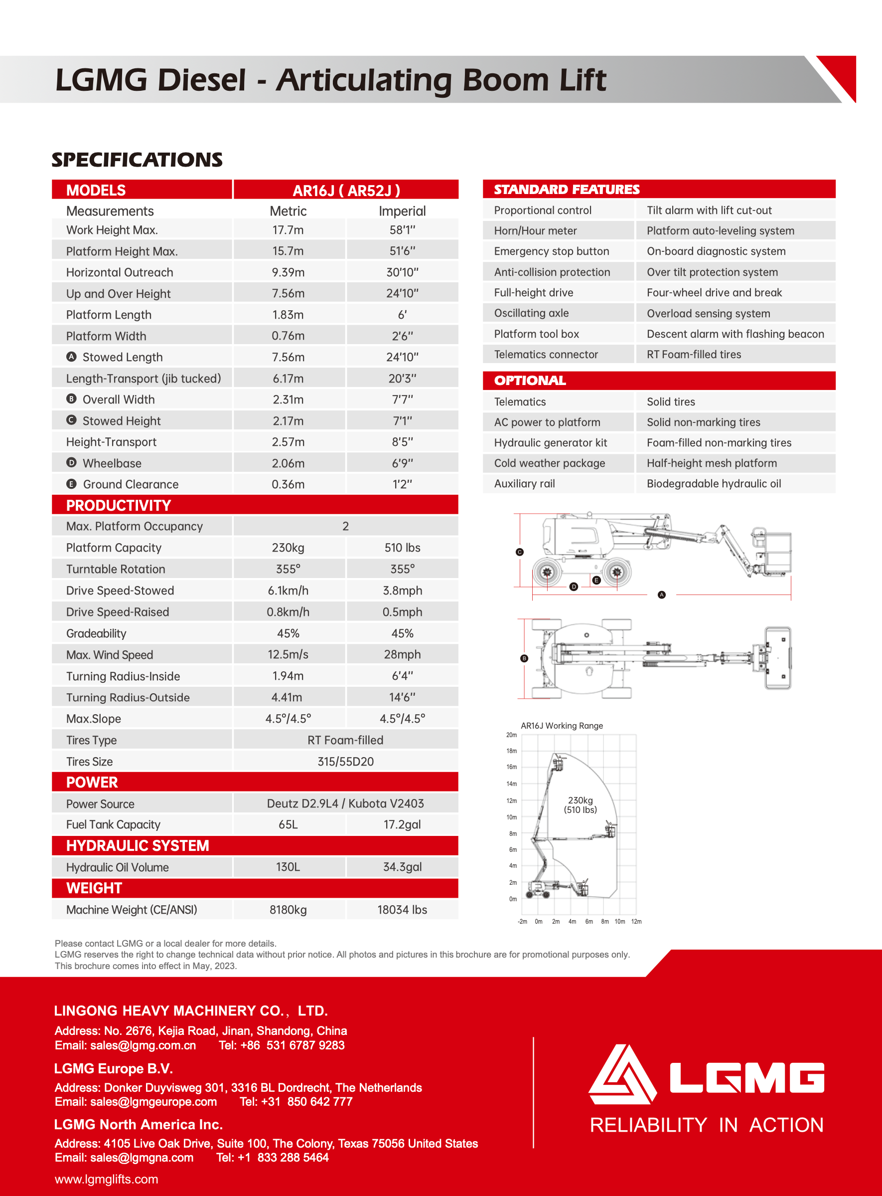 Built for performance and safety, this model offers a 15.7 m platform height, 230 kg platform capacity, and exceptional horizontal outreach, making it ideal for construction, maintenance, and installation work on rough terrain.