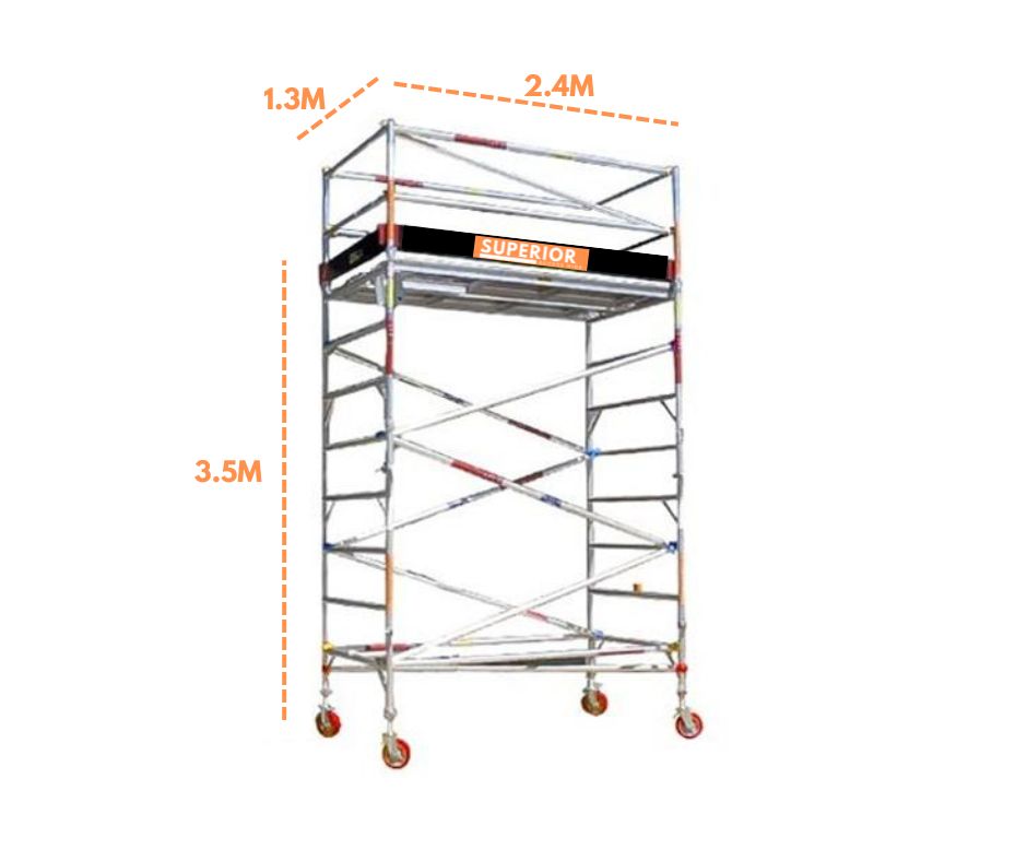 Professional Aluminium Mobile Scaffolding Tower with Guardrail - adjustable legs with big 8 inch heavy duty casters and platforms with trap doors for easy access. These scaffold towers are suitable for both internal and external use and are made from lightweight aluminium. The modular components make it easy to transport on the back of a ute, trailer or truck. Once erected, the mobile scaffolding can be safely moved via the heavy duty lockable caster wheels.
